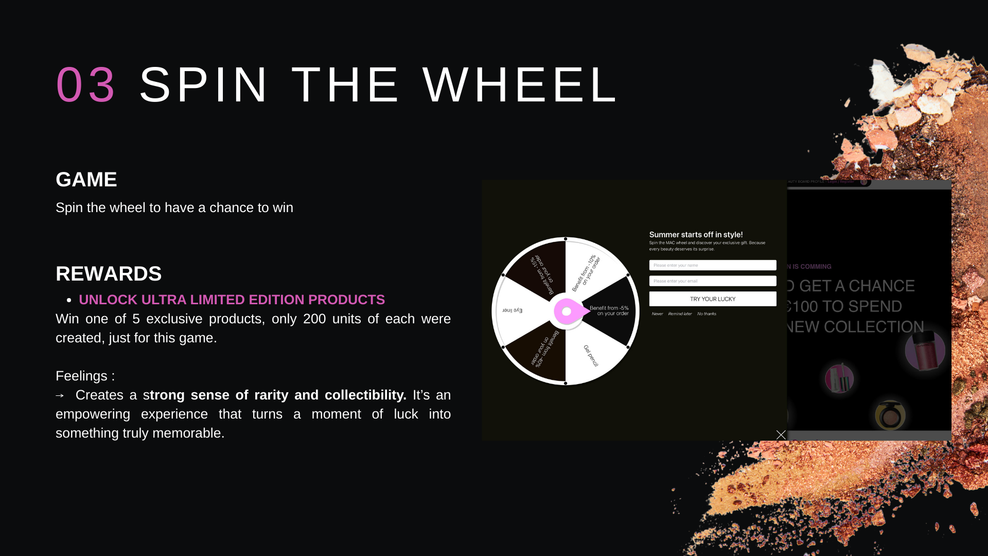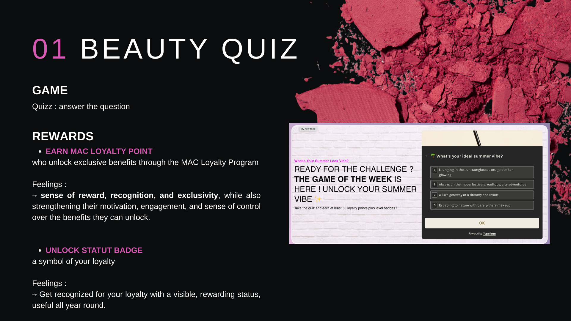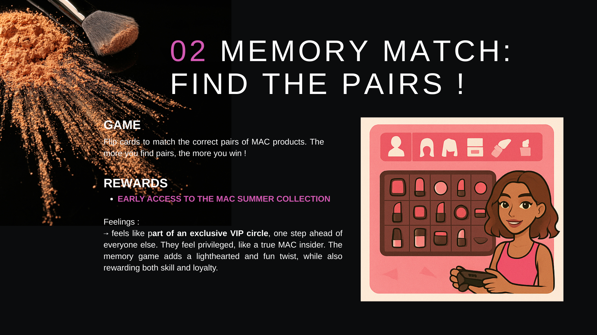 L’objectif du projet était de développer une landing page gamifiée pour accompagner le lancement de la collection d’été de MAC Cosmetics.