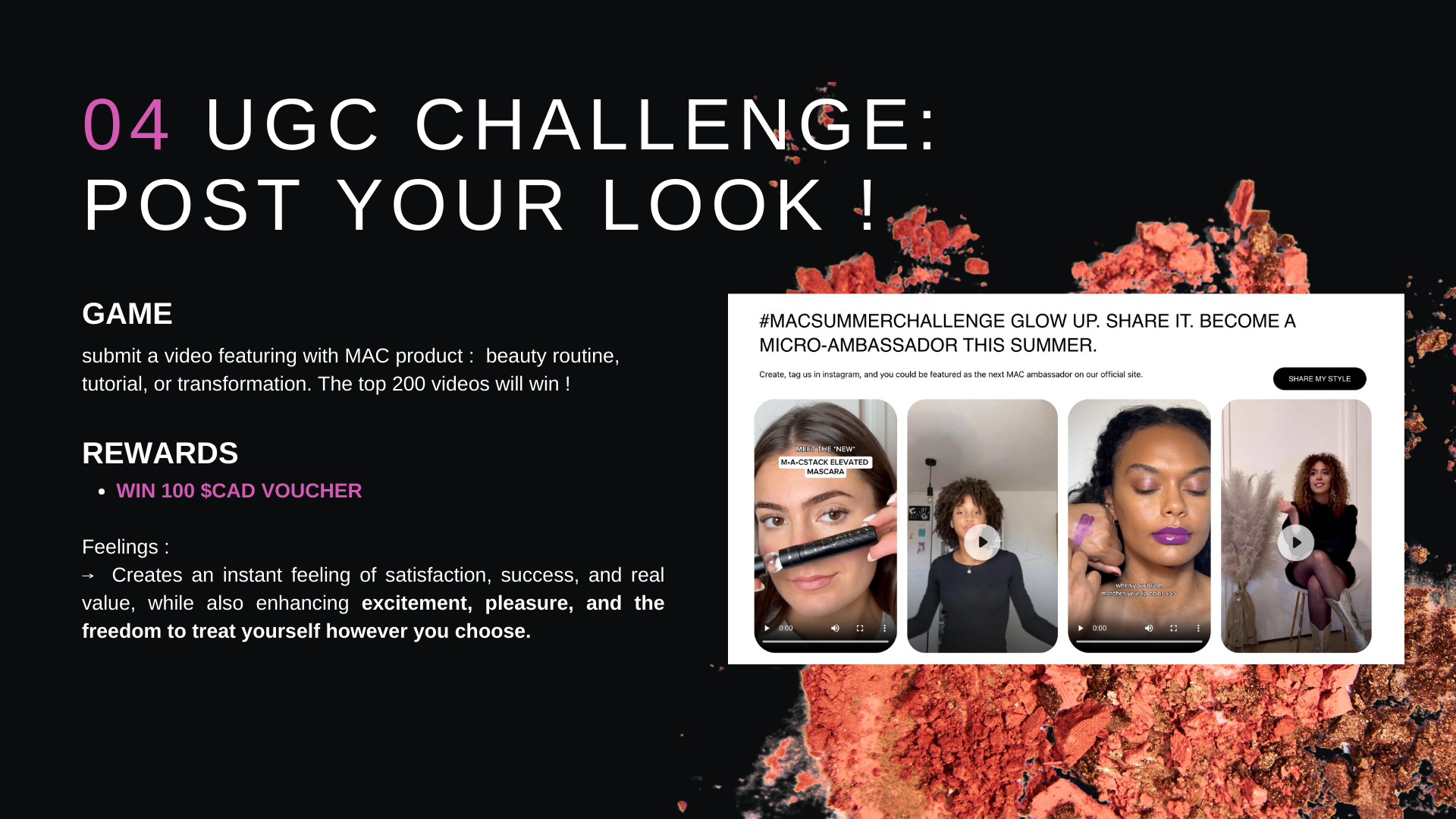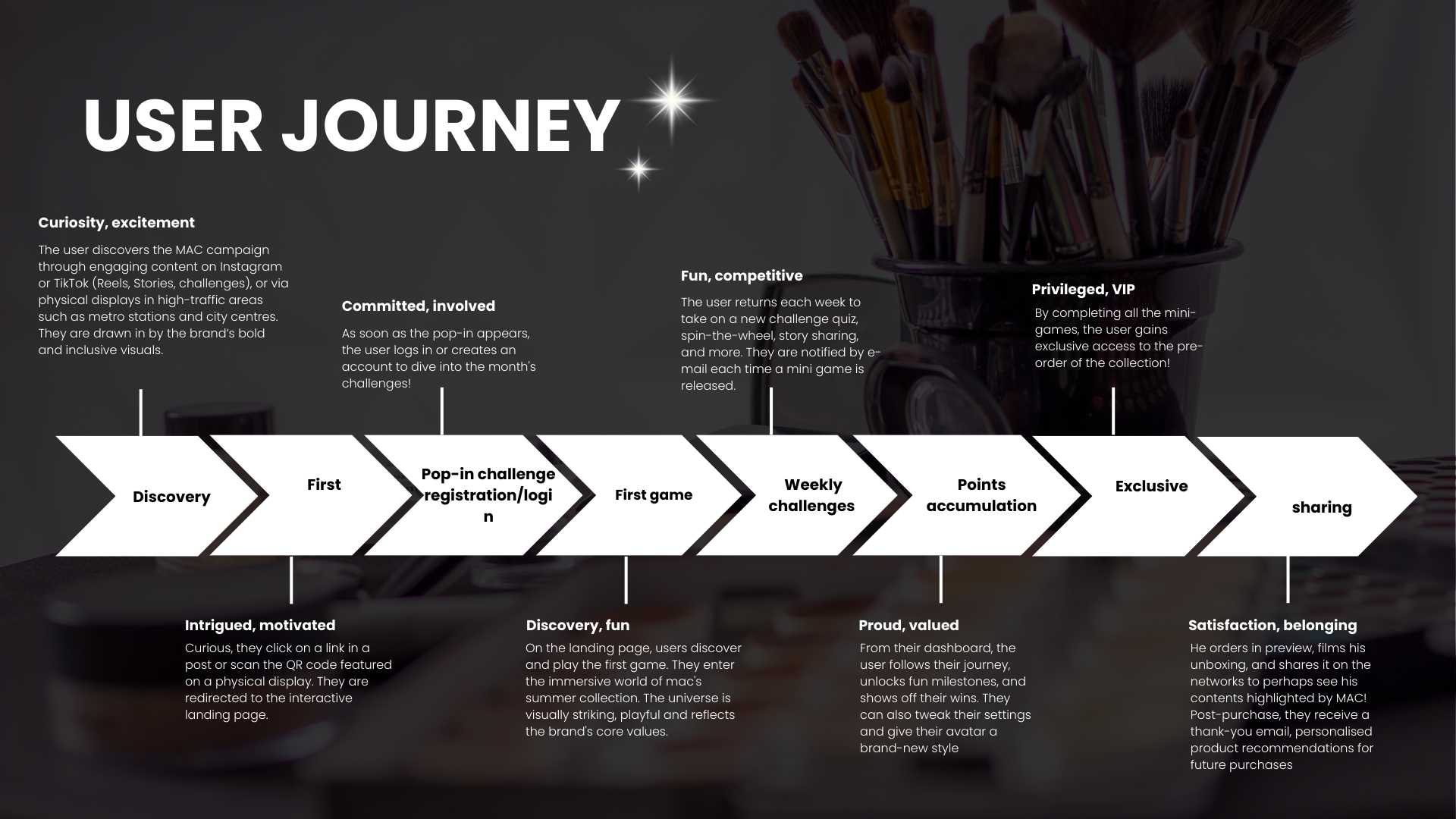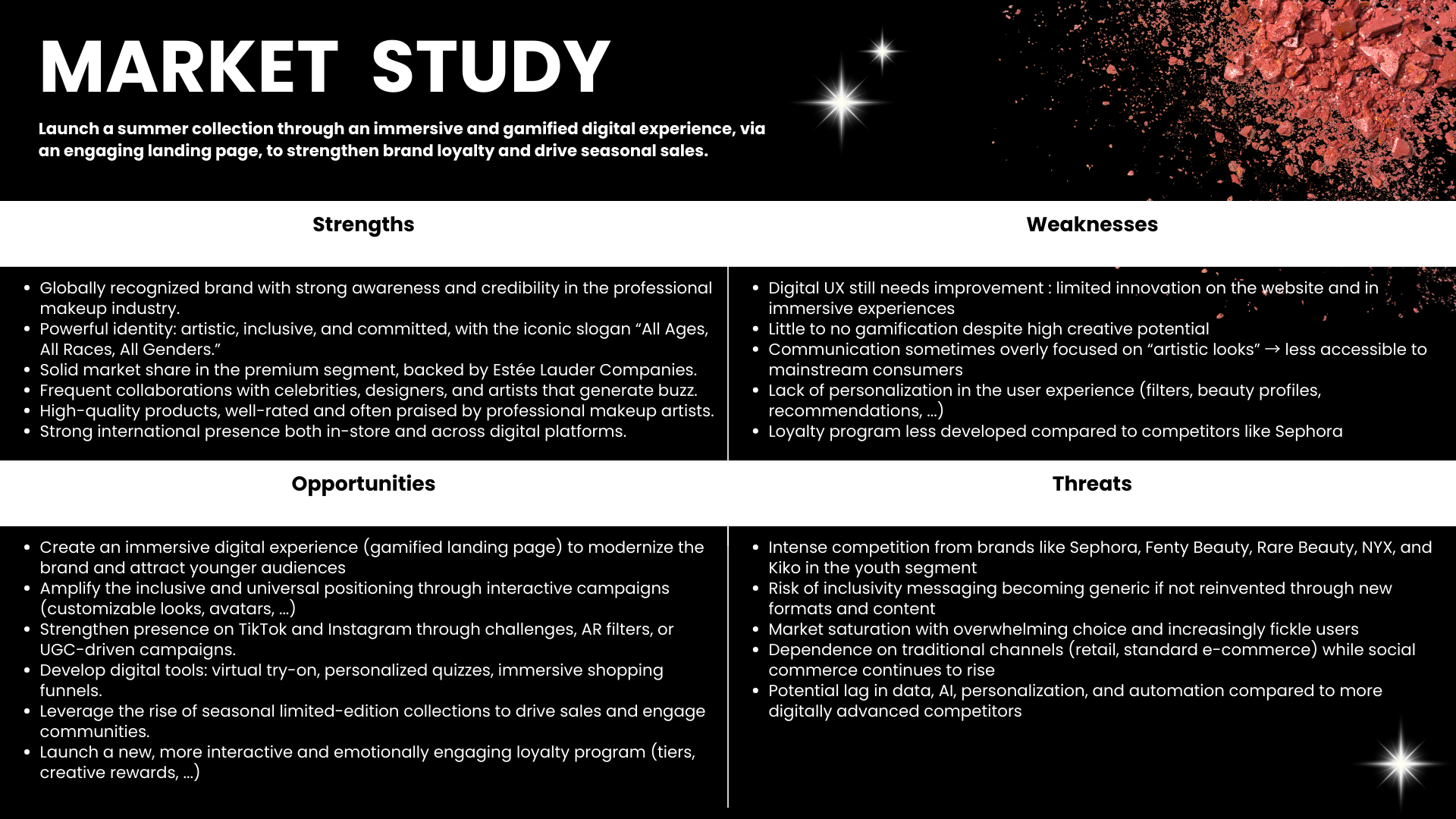 • Étude du marché canadien : compréhension des modes de communication, identification de la cible pour la nouvelle collection, analyse du système de fidélisation déjà en place chez MAC et des initiatives existantes en matière de gamification.
