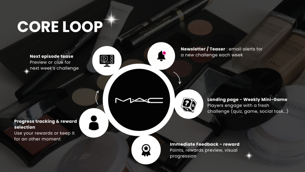 • Élaboration du cycle de jeu (core loop) : comment faire découvrir la landing page, encourager les retours hebdomadaires et maintenir l’engagement des clients.