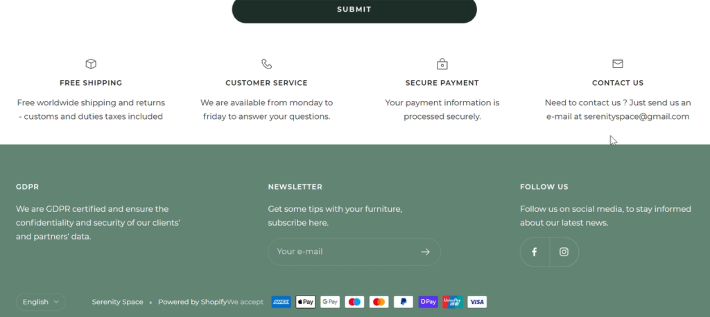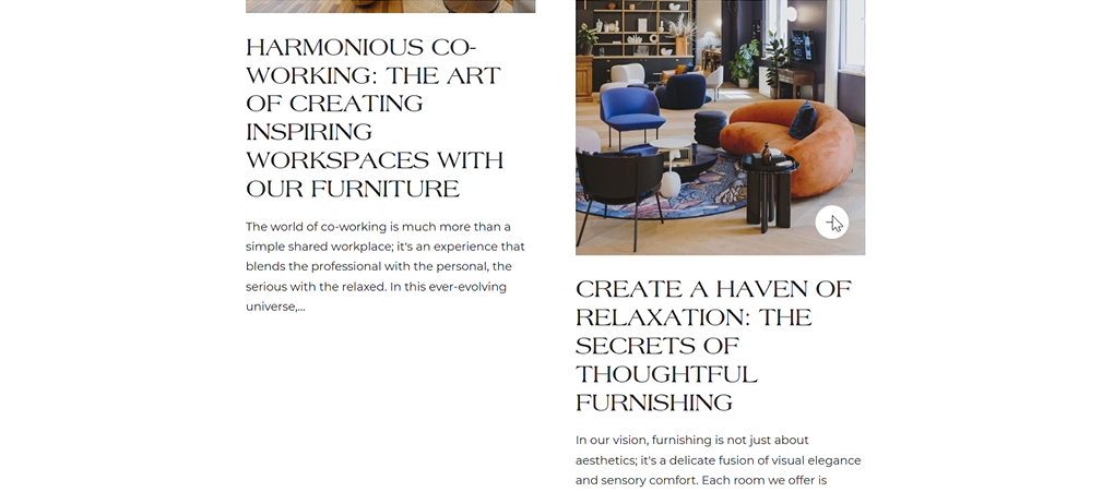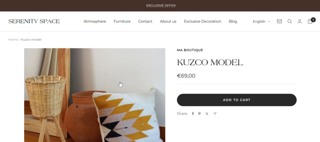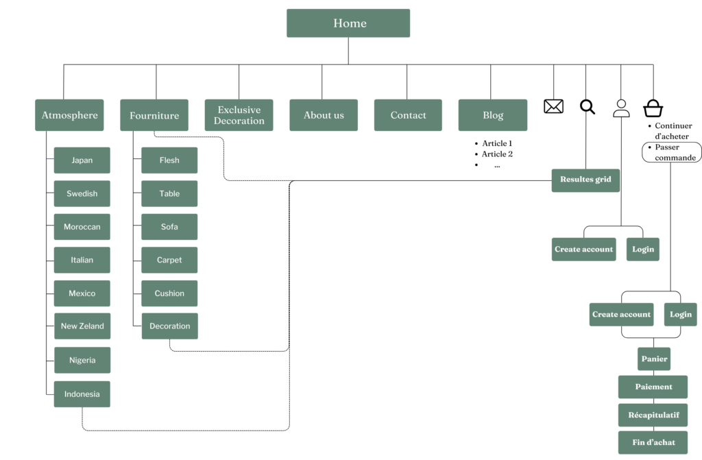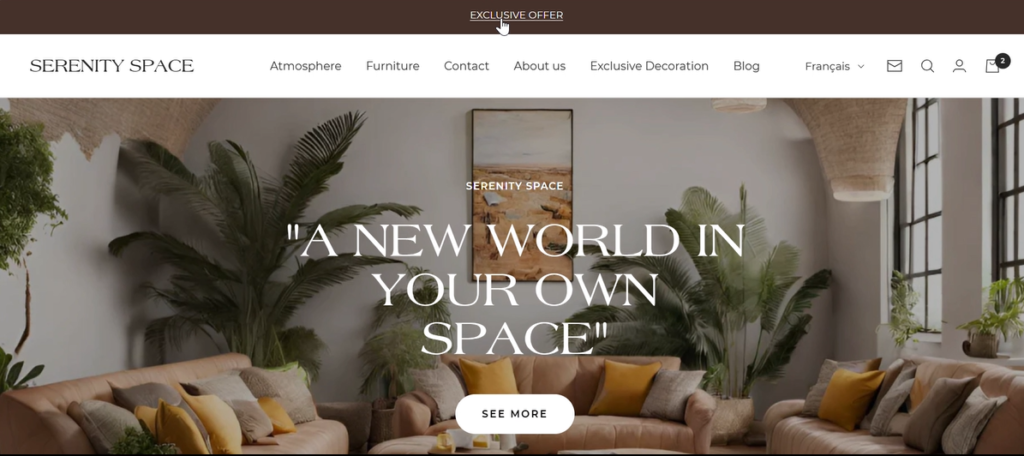 À partir du menu de navigation, les utilisateurs peuvent parcourir toutes les atmosphères (salles) ou explorer les meubles vendus à l’unité, lire des articles du blog ou en savoir plus sur Serenity Space. Ils peuvent s’inscrire à la newsletter gace au formulaire d’inscription et rechercher des articles par mot-clé grâce à la fonction recherche. Les utilisateurs peuvent aussi créer un compte et ainsi avoir accès à leur panier de commande.