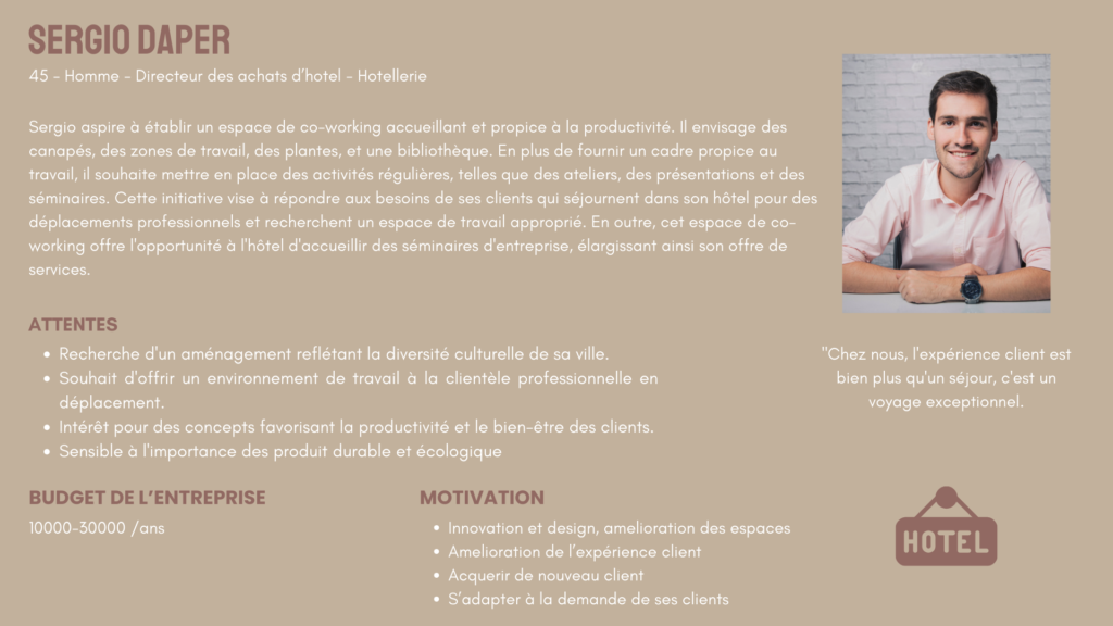 Après avoir compilé les résultats de mes recherches, j’ai pu créer un personna qui représente le groupe d’utilisateurs principal. Celui ci met en évidence des traits aspects, qui sont de vrais guides pour la définition des fonctionnalités de la plateforme et la réalisation du prototype.